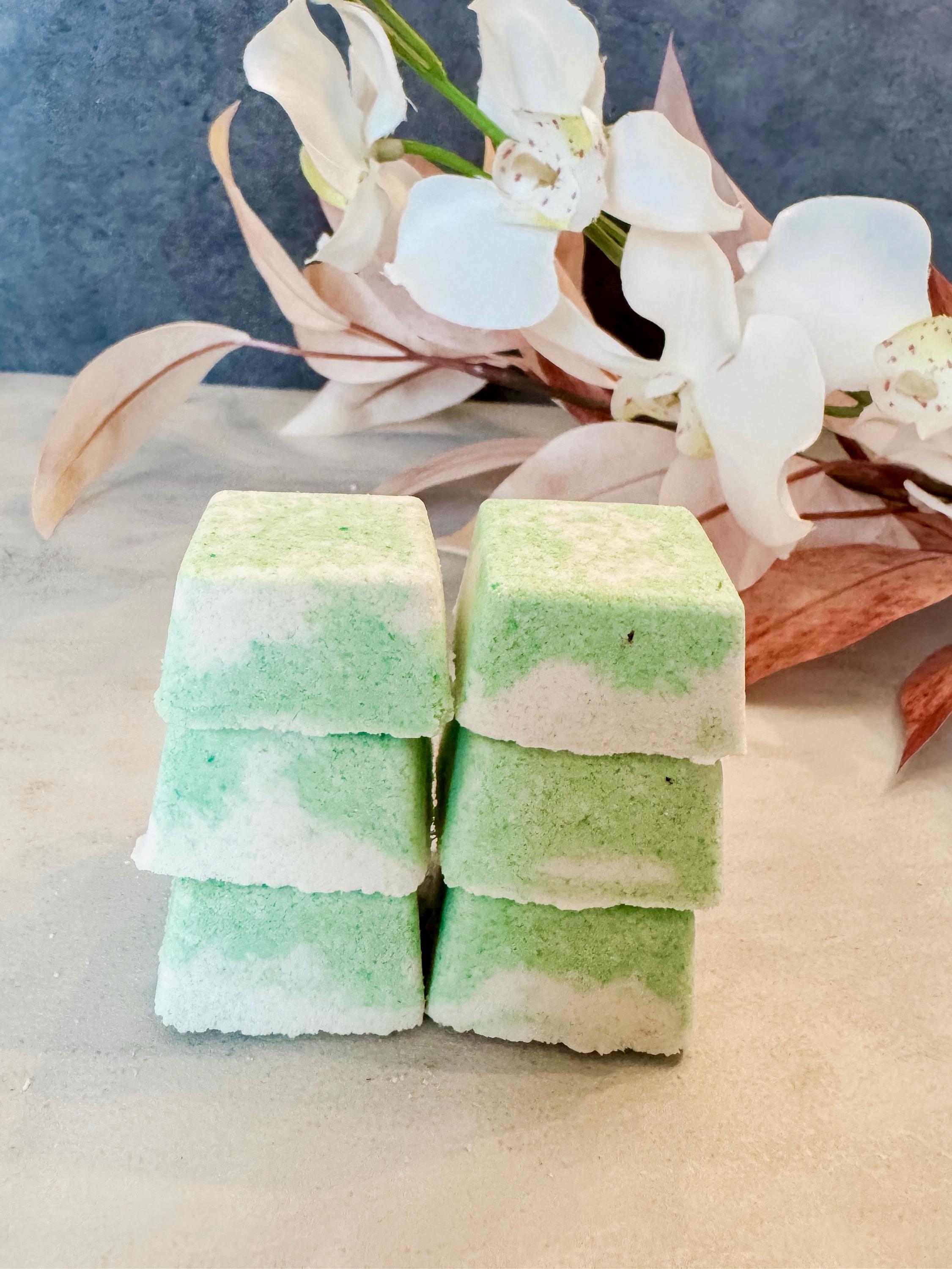 To use the shower steamers, you need to run hot water to fill the space with steam. Then sprinkle some water on the square and let it fizz a little so Essential oils can evaporate and cling to the steam. The shower steamer will fizz and dissolve a little. It can be used in a couple of showers.